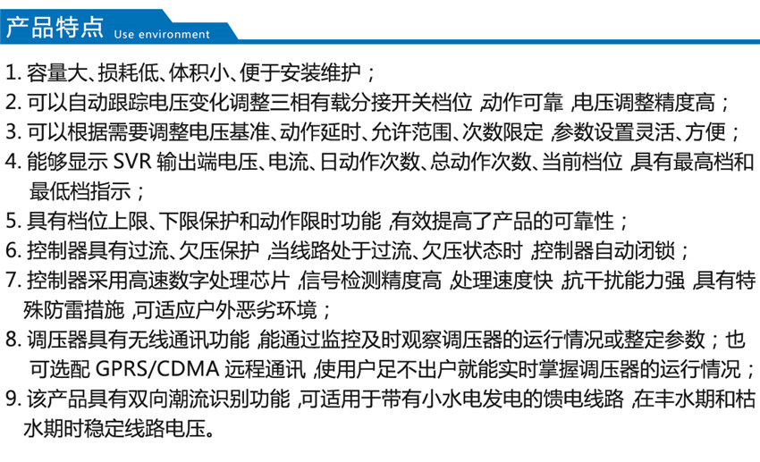 我公司生產的SVR型線路自動調壓變壓器原理是SVR與10kV 柱上無功自動補償裝置GWJ配合使用,可有效地解決線路電壓低及無功電源不足的問題。SVR 能有效地調節電路電壓, GWJ無功補償裝置能有效補償無功,提高功率因數,降低線損,其效果相當于一個簡易的柱上變電站,而造價僅為常規變電站的1/6~1/10。而成本只有變電站的1/6,1/7,而且無需工作人員值班維護。