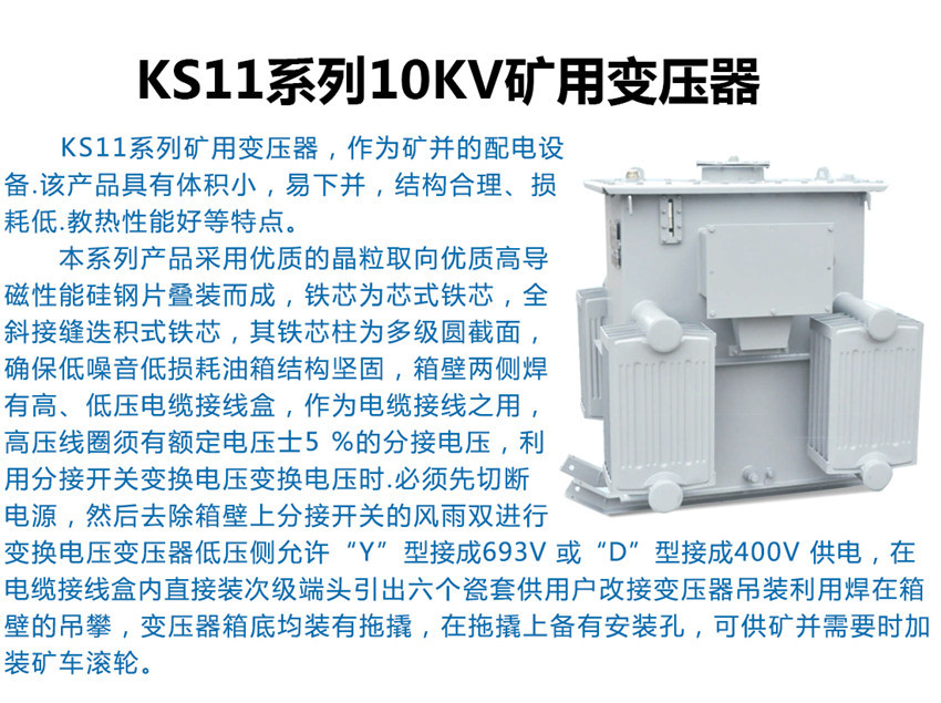 KS11變壓器適用于煤礦井下中央變電所、井底車場、總進(jìn)風(fēng)道和主要進(jìn)風(fēng)道,雖有瓦斯但無爆炸危險的場所。也適用于隧道比較潮濕的環(huán)境中